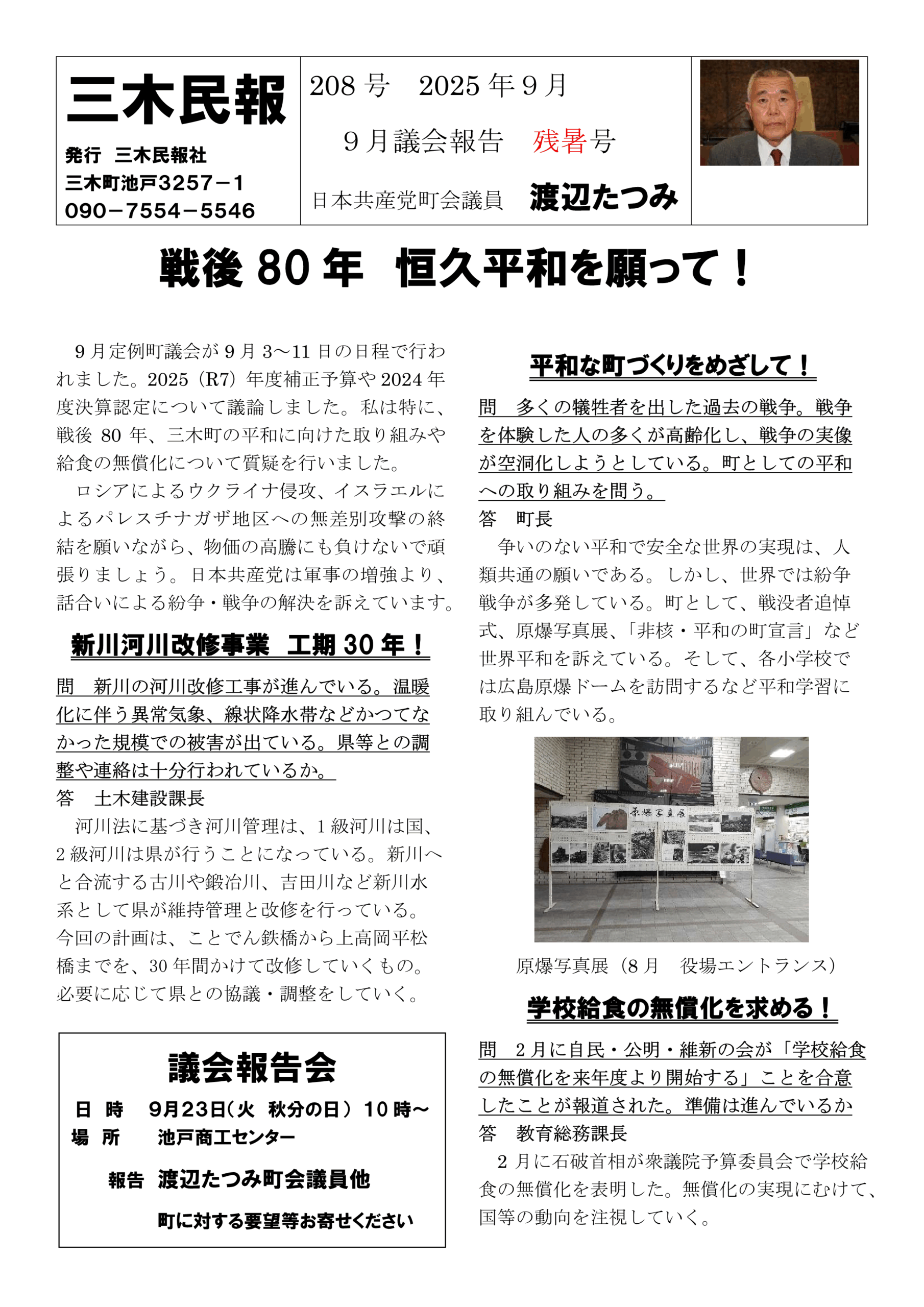 日本共産党 三木町議会議員『渡辺たつみ』のごあいさつ